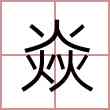 焱字字义: 焱:指火花、火焰、光华、光焰。 |