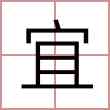(会意。从门之下一之上。甲骨文字形。象屋里俎上有肉的形状。本义:合适;适宜)同本义